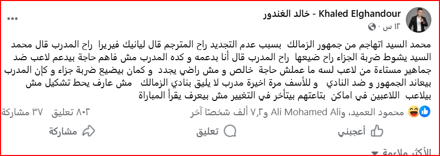 وكتب الغندور عبر حسابه الرسمي على فيسبوك قائلًا: «محمد السيد اتهاجم من جمهور الزمالك بسبب عدم التجديد، المترجم قال لفيريرا، والمدرب قرر يخليه يشوط ضربة الجزاء، ضيعها والمدرب بيقول أنا بدعمه! المدرب مش فاهم حاجة».