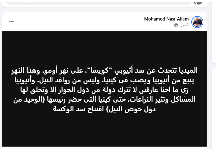 وأضاف علام عبر حسابه على موقع التواصل الاجتماعي "فيس بوك"، أن سد كويشا الذي تعمل إثيوبيا الفترة الحالية على إنشاءه لا يقع على نهر النيل وإنما يقع على نهر أومو، مشيرًا إلى أن النهر ينبع من إثيوبيا ويصب فى كينيا.