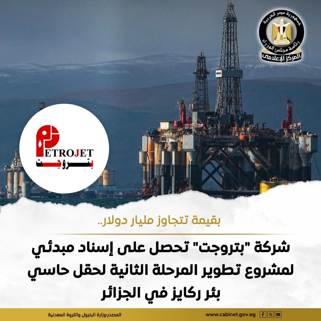 أعلنت شركة المشروعات البترولية والاستشارات الفنية "بتروجت" (Petrojet) عن فوزها بالإسناد المبدئي لعقد المقاول العام لمشروع تطوير المرحلة الثانية لحقل حاسي بئر ركايز بالجمهورية الجزائرية.