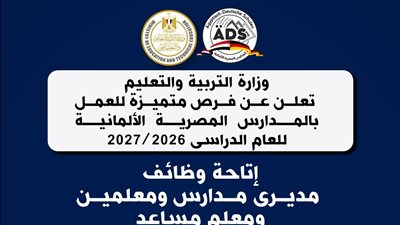 وتوضح الوزارة أن الوظائف المتاح التقديم إليها بالمدارس المصرية الألمانية للعام الدراسى 2026\2027، هى مدير مدرسة – معلم رياض أطفال لتعليم اللغة الألمانية – مساعدي معلم لغة ألمانية رياض أطفال - معلم لغة عربية رياض أطفال – معلم تربية رياضية رياض أطفال – معلم تربية موسيقية رياض أطفال – أخصائي اجتماعى رياض أطفال.