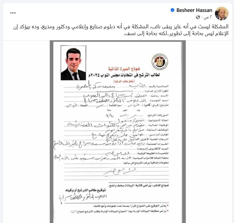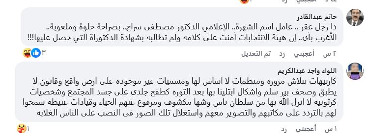 بينما كتب حاتم عبد القادر ساخرًا: “دا رجل عقر.. عامل اسم الشهرة الإعلامي الدكتور مصطفى سراج.. بصراحة حلوة وملعوبة.. الأغرب إن هيئة الانتخابات أمنت على كلامه ولم تطالبه بشهادة الدكتوراه!”.