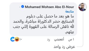 قال حساب يحمل اسم محمد محسن أبو النور: “ما هو بعد ما حصل على دبلوم الصنايع، حضر الدكتوراه مباشرة، والحمد لله ناقش الرسالة على القهوة إللي جنب بيتهم”.