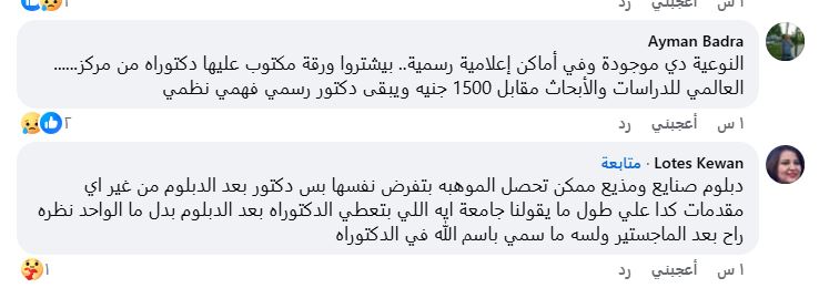 وكتب أيمن بدرا تعليقًا يلمّح إلى ظاهرة الشهادات الوهمية: “النوعية دي موجودة في أماكن إعلامية رسمية.. بيشتروا ورقة مكتوب عليها دكتوراه من مركز... العالمي للدراسات والأبحاث مقابل 1500 جنيه ويبقى دكتور رسمي فهمي نظمي”.