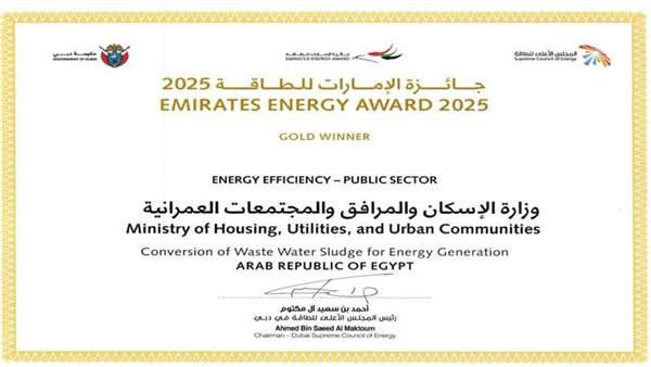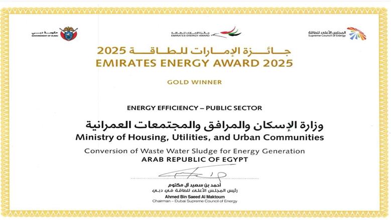 ريادة مصر الخضراء تتألق، مشروع "الإسكان" لتحويل الحمأة لطاقة يفوز بجائزة الإمارات للطاقة