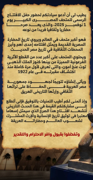 يطيب لي أن أدعو سيادتكم لحضور حفل الافتتاح الرسمي للمتحف المصري الكبير يوم 1 نوفمبر 2025، والذي يعد صرحا حضاريا وثقافيا فريدا من نوعه، فهو أكبر متحف في العالم ويروي تاريخ الحضارة المصرية القديمة ويمثل افتتاحه إحدى أهم وأبرز المحطات الثقافية في تاريخ مصر الحديث.