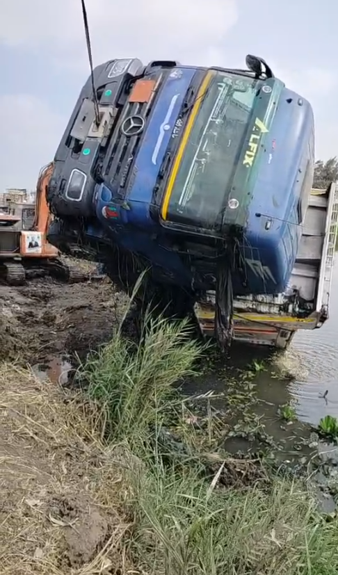 بالصور، انقلاب سيارة تريلا داخل مصرف مائي بمحافظة الدقهلية