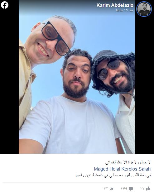 قال كريم عبد العزيز عبر حسابة الشخصي على موقع التواصل الاجتماعي "فيسبوك": "ماجد وكيرلس ذهبا لأداء أوْردر تصوير خاص لمصنع تابع لشركة صن كريت في بورسعيد."