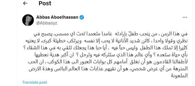 وكتب عباس أبو الحسن عبر حسابه الرسمي على موقع التواصل الاجتماعي، وكتب نصًا: “في هذا الزمن ، من ينجب طفلً بإرادته عامدا متعمدا تحت اي مسمى، يصبح في نظري وقولا واحدا ، كائن شديد الأنانية لا يحب إلا نفسه ويرتكب خطيئة كبرى، لا يعنيه كثيرا إلا تملك هذا الطفل وليس حباً فيه”.