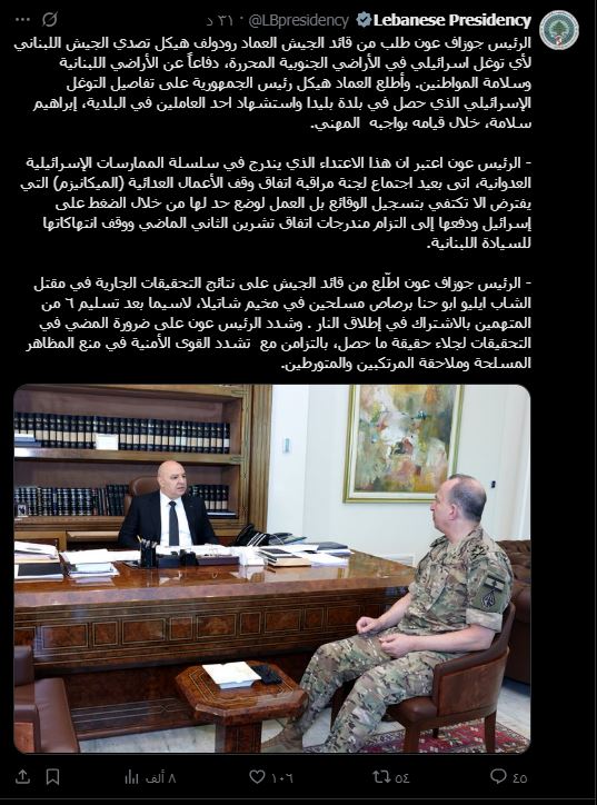 الرئيس اللبناني يطالب قائد الجيش بالتصدي لأي توغل إسرائيلي في الجنوب