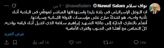 مضيفًا: "أقدم التعازي الحارة إلى عائلة سلامة الذي اغتيل أثناء قيامه بواجبه، وإلى كل أبناء الجنوب والقرى الأمامية الذين يدفعون يوميًا ثمن تمسكهم بأرضهم وحقهم في العيش بأمان وكرامة تحت سيادة الدولة اللبنانية وسلطتها".