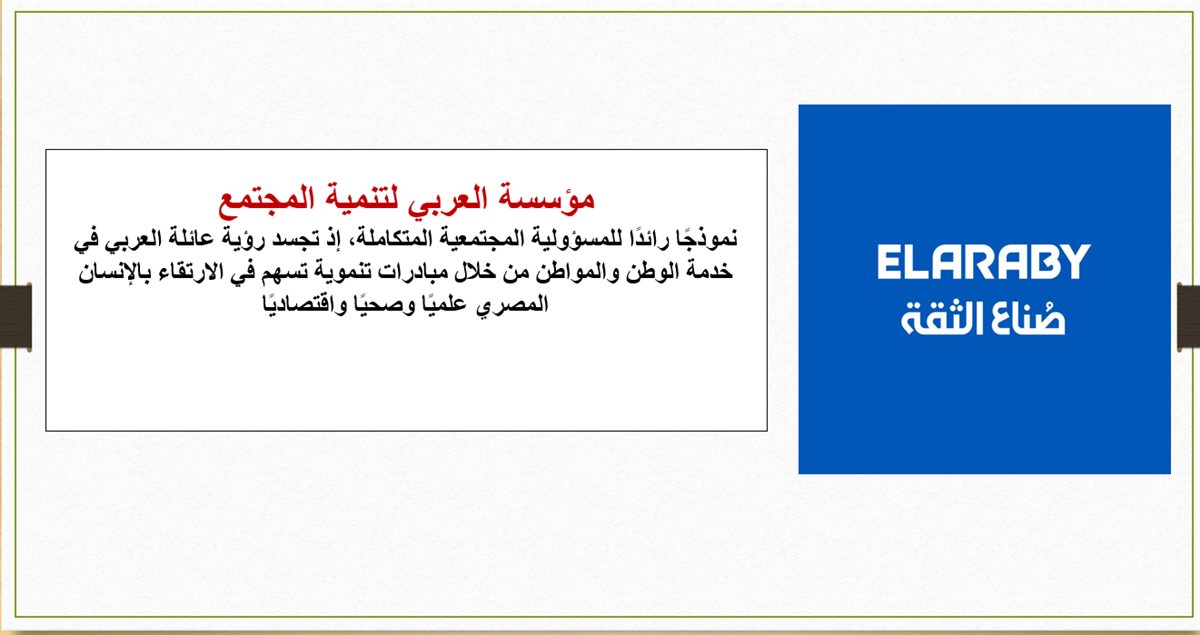 - مؤسسة العربي لتنمية المجتمع، نموذجًا رائدًا للمسؤولية المجتمعية المتكاملة، إذ تجسد رؤية عائلة العربي في خدمة الوطن والمواطن من خلال مبادرات تنموية تسهم في الارتقاء بالإنسان المصري علميًا وصحيًا واقتصاديًا.