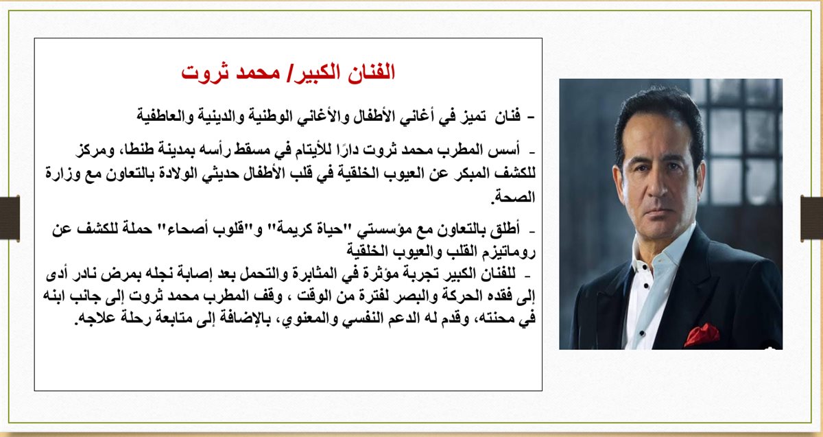 - الفنان الكبير محمد ثروت، فنان تميز في أغاني الأطفال والأغاني الوطنية والدينية والعاطفية، وأسس ثروت دارًا للأيتام في مسقط رأسه بمدينة طنطا، ومركز للكشف المبكر عن العيوب الخلقية في قلب الأطفال حديثي الولادة بالتعاون مع وزارة الصحة، وأطلق بالتعاون مع مؤسستي "حياة كريمة" و"قلوب أصحاء" حملة للكشف عن روماتيزم القلب والعيوب الخلقية، له تجربة مؤثرة في المثابرة والتحمل بعد إصابة نجله بمرض نادر أدى إلى فقده الحركة والبصر لفترة من الوقت، وقف المطرب محمد ثروت إلى جانب ابنه في محنته، وقدم له الدعم النفسي والمعنوي، بالإضافة إلى متابعة رحلة علاجه.