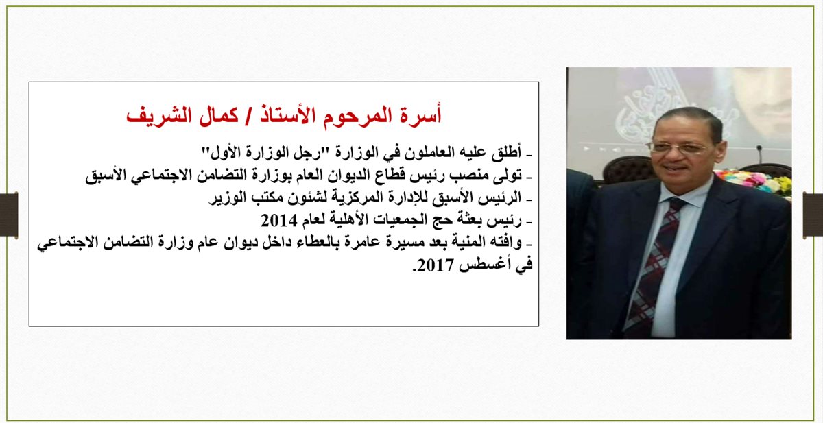 - أسرة المرحوم الأستاذ كمال الشريف، أطلق عليه العاملون في الوزارة "رجل الوزارة الأول"، وتولى منصب رئيس قطاع الديوان العام بوزارة التضامن الاجتماعي الأسبق، والرئيس الأسبق للإدارة المركزية لشئون مكتب الوزير، ورئيس بعثة حج الجمعيات الأهلية لعام 2014، وافته المنية بعد مسيرة عامرة بالعطاء داخل ديوان عام وزارة التضامن الاجتماعي في أغسطس 2017.