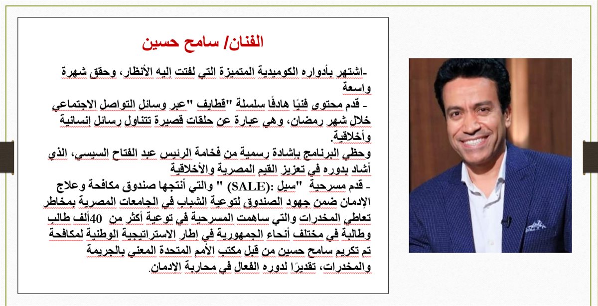 - الفنان سامح حسين اشتهر بأدواره الكوميدية المتميزة التي لفتت إليه الأنظار، وحقق شهرة واسعة، وقدم محتوى فنيًا هادفًا سلسلة "قطايف" عبر وسائل التواصل الاجتماعي خلال شهر رمضان، وهي عبارة عن حلقات قصيرة تتناول رسائل إنسانية وأخلاقية، وحظي البرنامج بإشادة رسمية من الرئيس عبد الفتاح السيسي، الذي أشاد بدوره في تعزيز القيم المصرية والأخلاقية، وقدم مسرحية "سيل" (SALE): والتي أنتجها صندوق مكافحة وعلاج الإدمان ضمن جهود الصندوق لتوعية الشباب في الجامعات المصرية بمخاطر تعاطي المخدرات والتي ساهمت المسرحية في توعية أكثر من 40 ألف طالب وطالبة في مختلف أنحاء الجمهورية في إطار الاستراتيجية الوطنية لمكافحة، وتم تكريم سامح حسين من قبل مكتب الأمم المتحدة المعني بالجريمة والمخدرات، تقديرًا لدوره الفعال في محاربة الإدمان.