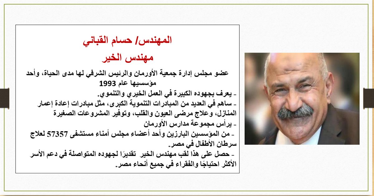 - المهندس حسام القباني، مهندس الخير، عضو مجلس إدارة جمعية الأورمان والرئيس الشرفي لها مدى الحياة، وأحد مؤسسيها عام 1993، يعرف بجهوده الكبيرة في العمل الخيري والتنموي، وساهم في العديد من المبادرات التنموية الكبرى، مثل مبادرات إعادة إعمار المنازل، وعلاج مرضى العيون والقلب، وتوفير المشروعات الصغيرة، ويرأس مجموعة مدارس الأورمان، ومن المؤسسين البارزين وأحد أعضاء مجلس أمناء مستشفى 57357 لعلاج سرطان الأطفال في مصر، وحصل على هذا لقب مهندس الخير تقديرًا لجهوده المتواصلة في دعم الأسر الأكثر احتياجًا والفقراء في جميع أنحاء مصر.