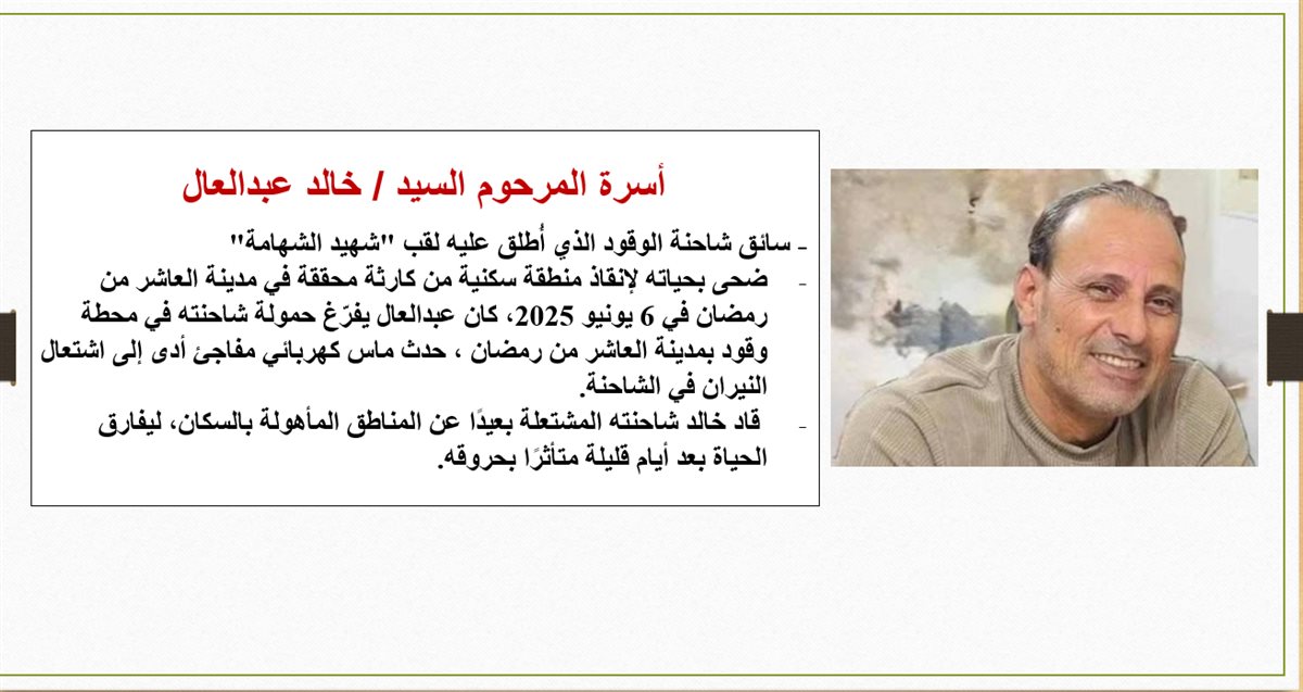 - أسرة المرحوم خالد عبدالعال، وسائق شاحنة الوقود الذي أُطلق عليه لقب "شهيد الشهامة"، وضحى بحياته لإنقاذ منطقة سكنية من كارثة محققة في مدينة العاشر من رمضان في 6 يونيو 2025، كان عبدالعال يفرّغ حمولة شاحنته في محطة وقود بمدينة العاشر من رمضان، حدث ماس كهربائي مفاجئ أدى إلى اشتعال النيران في الشاحنة، وقاد خالد شاحنته المشتعلة بعيدًا عن المناطق المأهولة بالسكان، ليفارق الحياة بعد أيام قليلة متأثرًا بحروقه.