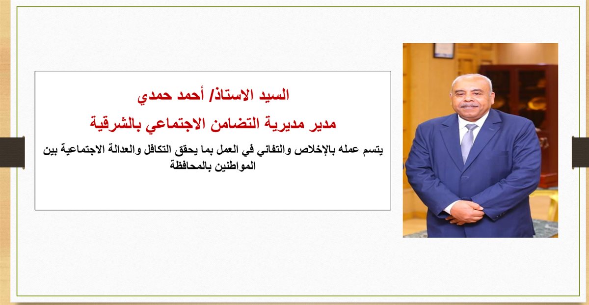 - الاستاذ أحمد حمدي، مدير مديرية التضامن الاجتماعي بالشرقية، يتسم عمله بالإخلاص والتفاني في العمل بما يحقق التكافل والعدالة الاجتماعية بين المواطنين بالمحافظة.