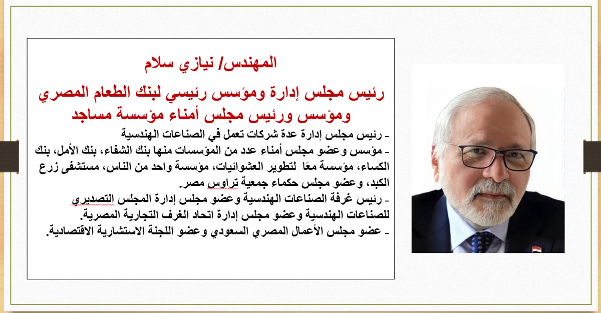 - المهندس نيازي سلام، ورئيس مجلس إدارة ومؤسس رئيسي لبنك الطعام المصري، ومؤسس ورئيس مجلس أمناء مؤسسة مساجد، ورئيس مجلس إدارة عدة شركات تعمل في الصناعات الهندسية، ومؤسس وعضو مجلس أمناء عدد من المؤسسات منها بنك الشفاء، بنك الأمل، بنك الكساء، مؤسسة معًا لتطوير العشوائيات، مؤسسة واحد من الناس، مستشفى زرع الكبد، وعضو مجلس حكماء جمعية تراوس مصر، ورئيس غرفة الصناعات الهندسية وعضو مجلس إدارة المجلس التصديري للصناعات الهندسية وعضو مجلس إدارة اتحاد الغرف التجارية المصرية، وعضو مجلس الأعمال المصري السعودي وعضو اللجنة الاستشارية الاقتصادية.
