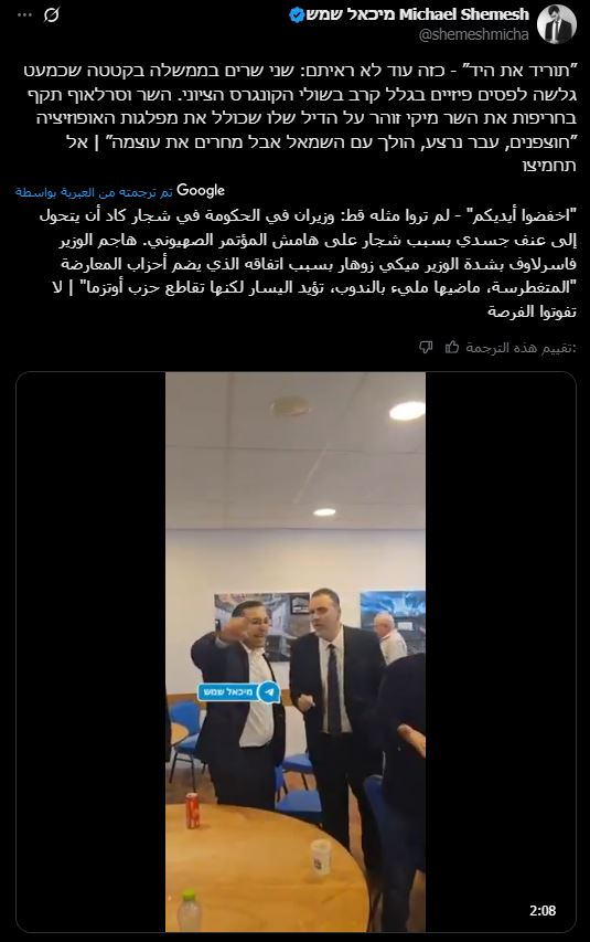 انتشر مقطع فيديو عبر منصات التواصل الاجتماعي، يكشف عن مواجهة حادة وصراخًا متبادلًا بين وزيرين في حكومة الاحتلال الإسرائيلية، وتطورت المواجهة إلى مشادة كادت تصل إلى العراك بالأيدي، قبل أن يتدخل الحضور لاحتواء الموقف.