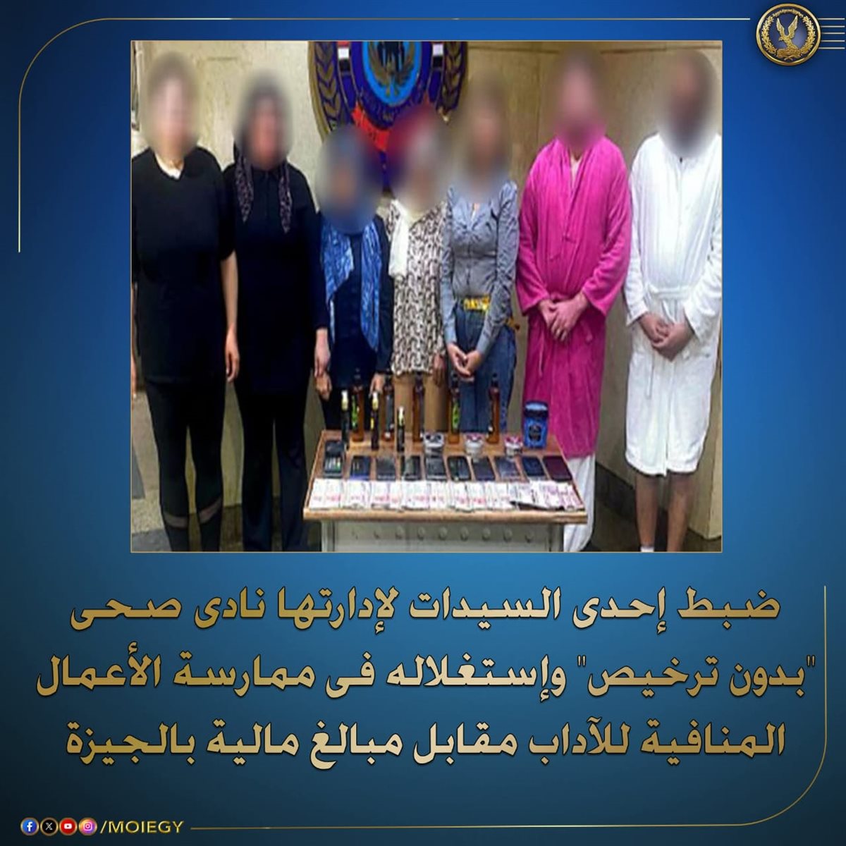 تمكنت الإدارة العامة لحماية الآداب بقطاع الشرطة المتخصصة من ضبط سيدة تدير نادٍ صحي بدون ترخيص بمنطقة ثان الشيخ زايد بمحافظة الجيزة، بعد ورود معلومات وتحريات أكدت استغلالها للمكان في ممارسة الأعمال المنافية للآداب مقابل مبالغ مالية، وذلك في إطار جهود وزارة الداخلية لمكافحة الجرائم المنافية للآداب العامة.
