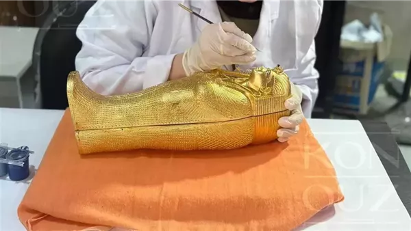 وأضاف شعراوي أن العملية بدأت من قسم النحت، حيث تولّى الفنانون تجسيد الزخارف والرموز والكتابات الهيروغليفية بدقة التماثل الأصلية، ثم انتقلت إلى مراحل الاستنساخ فالتذهيب فالتلوين، قبل أن يُغلّف التابوت من الداخل بقماش المخمل الفاخر، لتظهر في صورتها النهائية التي تليق بعظمة الاحتفالية ومكانة المتحف.