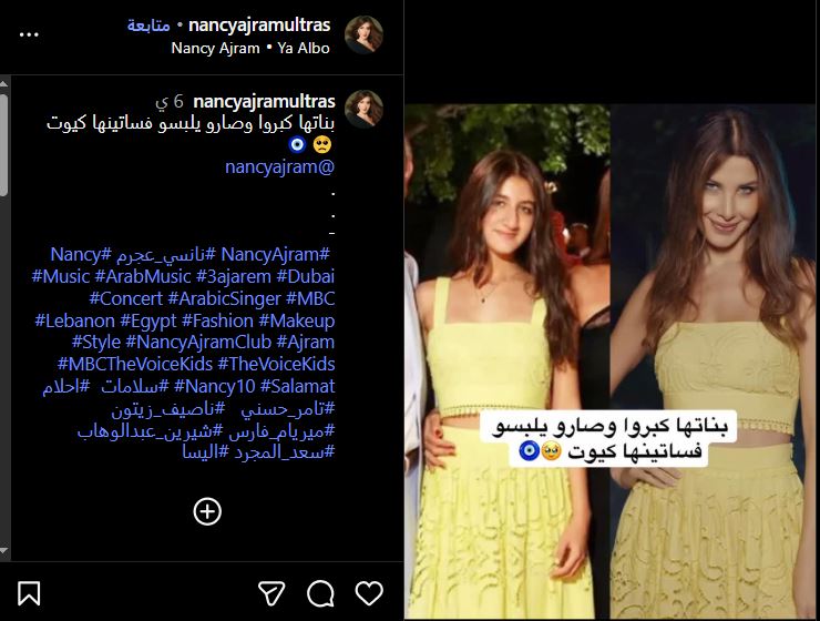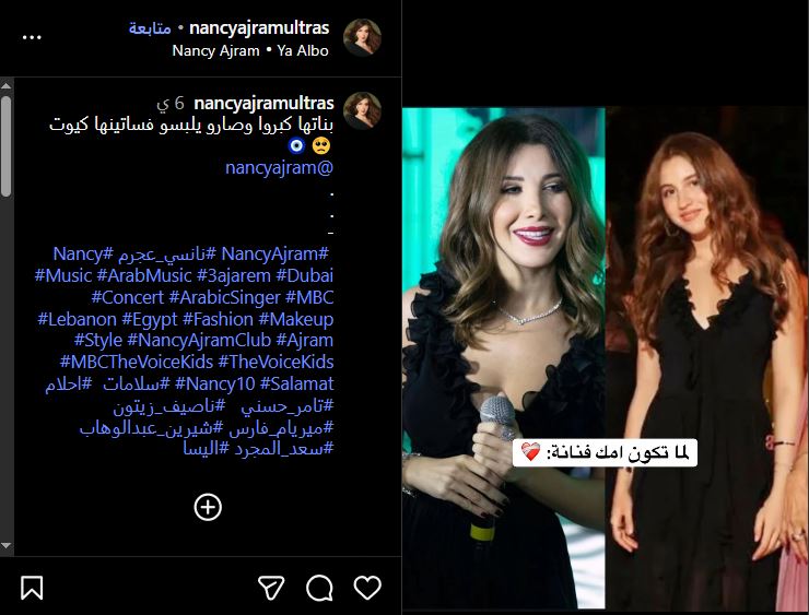 صور ابنتا المطربة نانسي عجرم حصدت تفاعلًا واسعًا عبر مواقع التواصل الاجتماعي، وأثنى المتابعون على أناقتهما وشبههما الكبير بوالدتهما.
