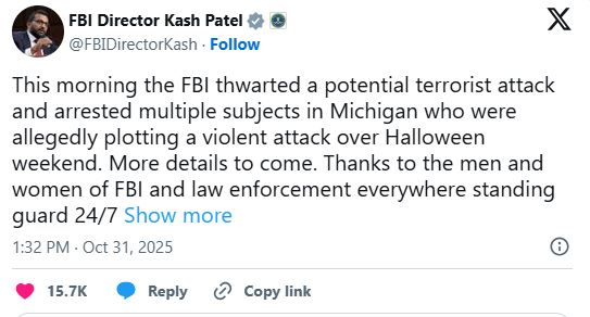 قال مدير مكتب التحقيقات الفيدرالي كاش باتيل إن مكتب التحقيقات الفيدرالي أحبط "هجومًا إرهابيًا محتملًا" كان من المفترض أن يستهدف عطلة نهاية الأسبوع بمناسبة عيد الهالوين في ميشيجان، صباح الجمعة.
