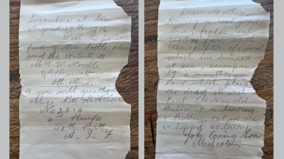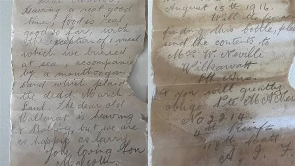 عُثر على ساحل غربي أستراليا على زجاجة زجاجية قديمة تحتوي على رسالتين كتبهما جنديان أستراليان عام 1916، خلال رحلتهما إلى ساحات القتال في أوروبا أثناء الحرب العالمية الأولى.