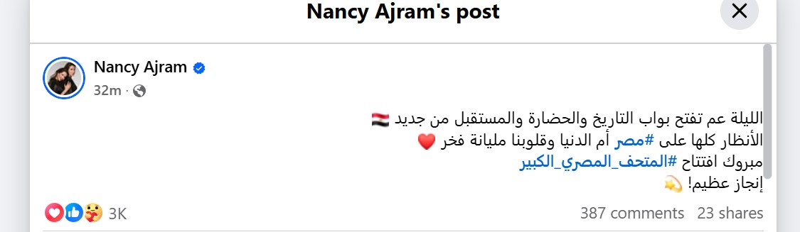 وكتبت نصًا: “الليلة عم تفتح بواب التاريخ والحضارة والمستقبل من جديد، الأنظار كلها على مصر أم الدنيا وقلوبنا مليانة فخر، مبروك افتتاح المتحف المصري الكبير، إنجاز عظيم”.