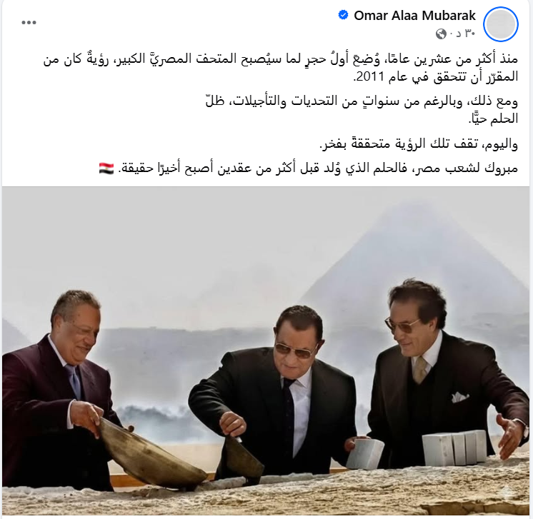وفي وقت سابق، قال عمر علاء مبارك، حفيد الرئيس الأسبق، محمد حسني مبارك، بالتزامن مع حفل افتتاح المتحف المصري الكبير، خلال صفحته الرسمية على فيسبوك: "منذ أكثر من عشرين عامًا، وُضِعَ أولُ حجرٍ لما سيُصبح المتحفَ المصريَّ الكبير، رؤيةٌ كان من المقرّر أن تتحقق في عام 2011".