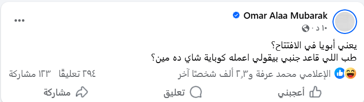 وقال عمر علاء مبارك خلال منشوره: "يعني أبويا في الافتتاح؟، طب إللي قاعد جنبي بيقولي أعمله كوباية شاي ده مين؟".