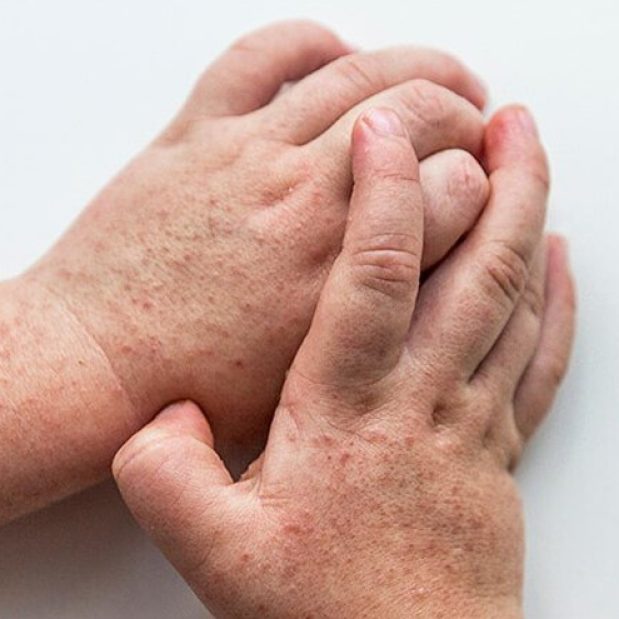 - طفح جلدي أحمر خشن يشبه وزرقة الصنفرة في ملمسها.