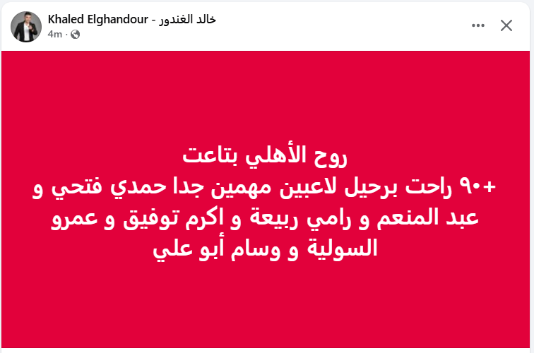 وكتب خالد الغندور نجم فريق الزمالك السابق ، عبر صفحته على مواقع التواصل الاجتماعي "فيسبوك" :" روح الأهلي بتاعت+٩٠ راحت، برحيل لاعبين مهمين جداً حمدي فتحي و محمد عبد المنعم و رامي ربيعة و أكرم توفيق وعمرو السولية ووسام أبو علي".